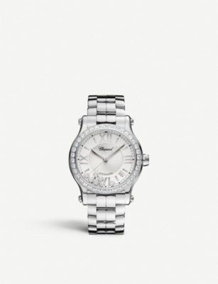 Chopard's stainless steel Happy Sport Medium watch is a classic you'll wear for a lifetime. Its fluid design is accentuated with a curved diamond-set bezel, silver-toned dial and signature moving diamonds. Delivery terms & conditions: customers can select a nominated day for delivery and will receive their order on or before 10.30am. For next day delivery orders need to be placed before 3pm on a weekday to arrive the following day before 10:30am and for next day delivery over the weekend, orders need to be placed before 12pm to arrive the following day before 10.30am. Customers must have a valid passport or driving licence as a measure of photographic ID. Only recipients with the same surname can accept the delivery on behalf of someone else. Please note: This item(s) can only be returned by calling 0800123400. Tracking terms & conditions: customers will receive a standard Selfridges email and carrier text message the night before delivery. Between 7-9am customers will receive a second text message with an hour time slot for delivery.| Chopard stainless steel and diamond watchReference number: 278551-3004Folding clasp fasteningRound case, glare-proof scratch-resistant sapphire crystal glass face, 0.17ct sapphire-set crown, Roman numerals, hours and minutes, seconds, date function, self-winding mechanical movement, 4 Hz (28,800 vibrations per hour), heavy metal oscillating weight, silver-toned with guilloché-worked centre, stainelss steel crown, stainless steel folding clasp, 0.17ct sapphire set in crown, 38 diamonds to bezel of 1.96ct, 7 free-moving diamonds beneath the bezel of 0.35ct, power reserve of 42 hoursCase dimension 36mm, minimum wrist circumference 13cm, maximum wrist circumference 16.5cmWater resistant to 30mMade in SwitzerlandChopard prides itself on providing excellent customer service. This includes contacting customers to offer after-sales care and share details about its brand and products. As such, when you order a Chopard product from us, your details will be passed onto Chopard so that it can provide these services to you Delivery terms & conditions: customers can select a nominated day for delivery and will receive their order on or before 10.30am. For next day delivery orders need to be placed before 3pm on a weekday to arrive the following day before 10:30am and for next day delivery over the weekend, orders need to be placed before 12pm to arrive the following day before 10.30am. Customers must have a valid passport or driving licence as a measure of photographic ID. Only recipients with the same surname can accept the delivery on behalf of someone else. Please note: This item(s) can only be returned by calling 0800123400Tracking terms & conditions: customers will receive a standard Selfridges email and carrier text message the night before delivery. Between 7-9am customers will receive a second text message with an hour time slot for delivery