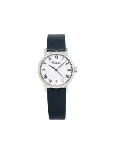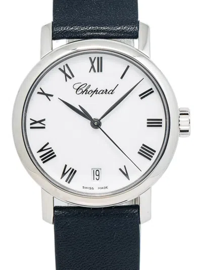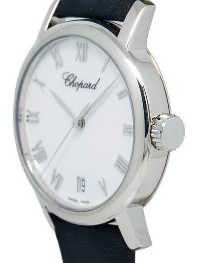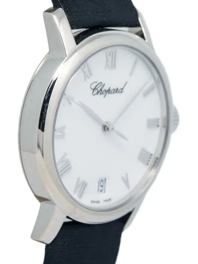 pre-owned 34mm round face white Roman numeral dial sword hands sweeping second hand 18kt white gold screw-down crown leather strap engraved case back quartz movement buckle fastening This item comes with a standard one-year warranty from the boutique.