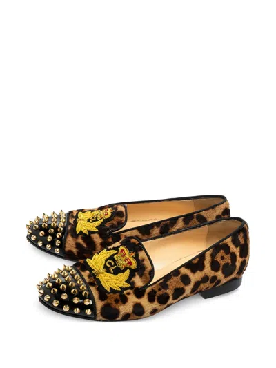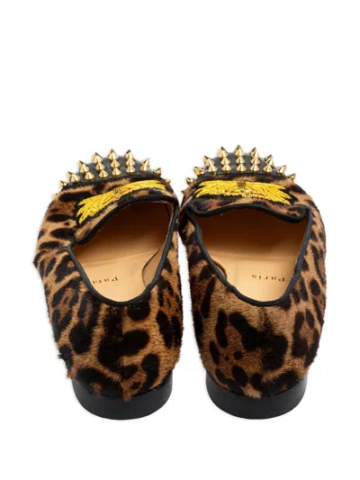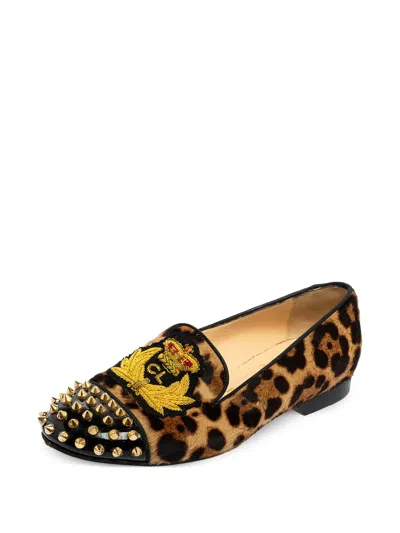 animalier brown/multicolour leopard print spike-stud detailing crest motif almond toe flat sole signature red sole branded insole Condition: GOOD. This previously owned and used item is in good condition with minimal signs of use. This may include fading of material or plating and scratches.