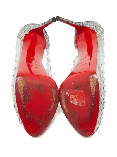 blue suede crystal embellishment platform peep toe red sole Condition: GOOD. This previously owned and used item is in good condition with minimal signs of use. This may include fading of material or plating and scratches.