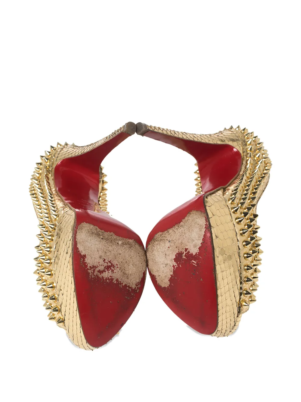 Pre-owned Studded Python-embossed Platform Pumps In Gold