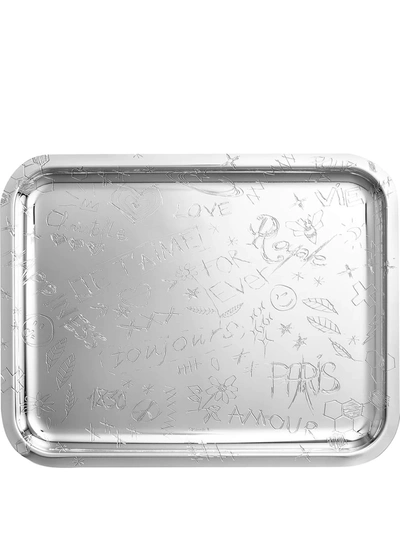 Don't get us wrong, we love seeing graffiti in its natural habitat - sprayed onto walls in rebellious protest - but we definitely love it scratched into the surface of elegant silverware too. That's Christofle's take, a modern ode to traditional decor. This tray has been decorated with doodles that look like they've come straight from a scribbled notebook, awash with French sayings, hearts and peace signs.Christofle silver-plated trayEngraved 'graffiti' motifs, polished finish, rectangle shapeDimensions: Height 28cm, width 36cmWipe with a clean, dry cloth