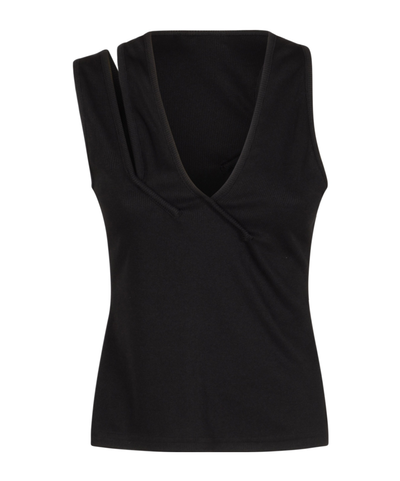 V-neck, double shoulder straps on one side, vest.