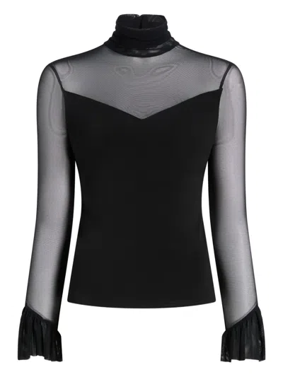Cinq a Sept Super Stretch Lucy Top in Black. - size XL (also in L, M, S, XS) Cinq a Sept Super Stretch Lucy Top in Black. - size XL (also in L, M, S, XS) Self: 85% polyester 15% spandex<bf>Contrast: 90% nylon 10% spandex. Made in China. Dry clean only. Back zipper closuure. Semi sweetheart neckline. Sheer sleeves and neckline above bodice. Double lined turtleneck and cuffs. Flare cuffs. CINR-WS212. ZW21312290Z. Cinq Sept is the time between late afternoon and early evening when the streets are awash in the warm glow of the vanishing sun and anything is possible. This beautiful meaning is highlighted throughout the lines collection - they strive to find that balance between day and night and sophistication and ease.