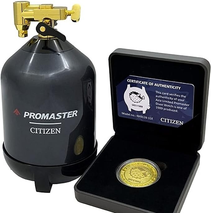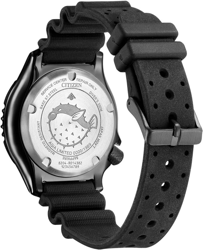 Introducing the Citizen Promaster Fugu Asia Limited NY0138-14X, a timepiece that seamlessly blends exquisite craftsmanship with a touch of exclusivity. This limited edition watch, adorned with a meticulously engraved 1989 serial number, pays homage to a bygone era while embodying contemporary sophistication. Engineered for aquatic enthusiasts, the watch boasts an impressive water resistance of up to 200 meters, making it the perfect companion for underwater adventures. Its luminous dial ensure optimal readability even in the depths, while the sapphire crystal provides unparalleled durability and scratch resistance. The robust 44 mm case exudes a bold presence, housing a Japanese-made movement caliber Cal.8204 that guarantees precision and reliability. The black rubber strap, secured with a pin buckle, not only adds a sporty edge but also ensures a comfortable fit for any wrist. Adding a touch of cultural charm, the case back is artfully engraved with the Japanese word "Fugu," meaning "pufferfish." This subtle