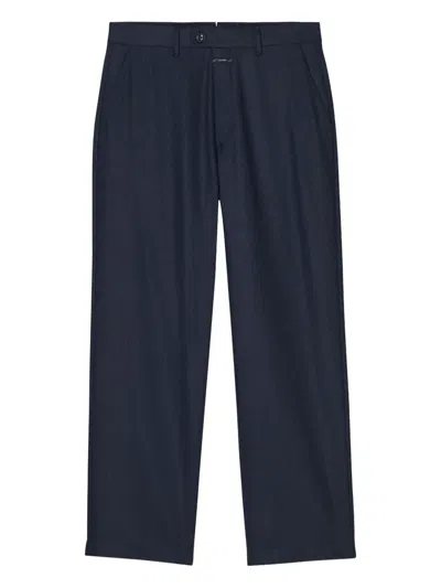 navy pleated details belt loops seam pockets welt pockets at the back button fastening