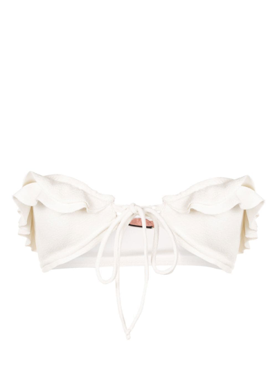 Bandara bikini top from CLUBE BOSSA featuring white, stretch-design, sleeveless, bandeau style, front tie fastening, scallop edge and frilled neckline. Be mindful to try on swimwear over your own garments..