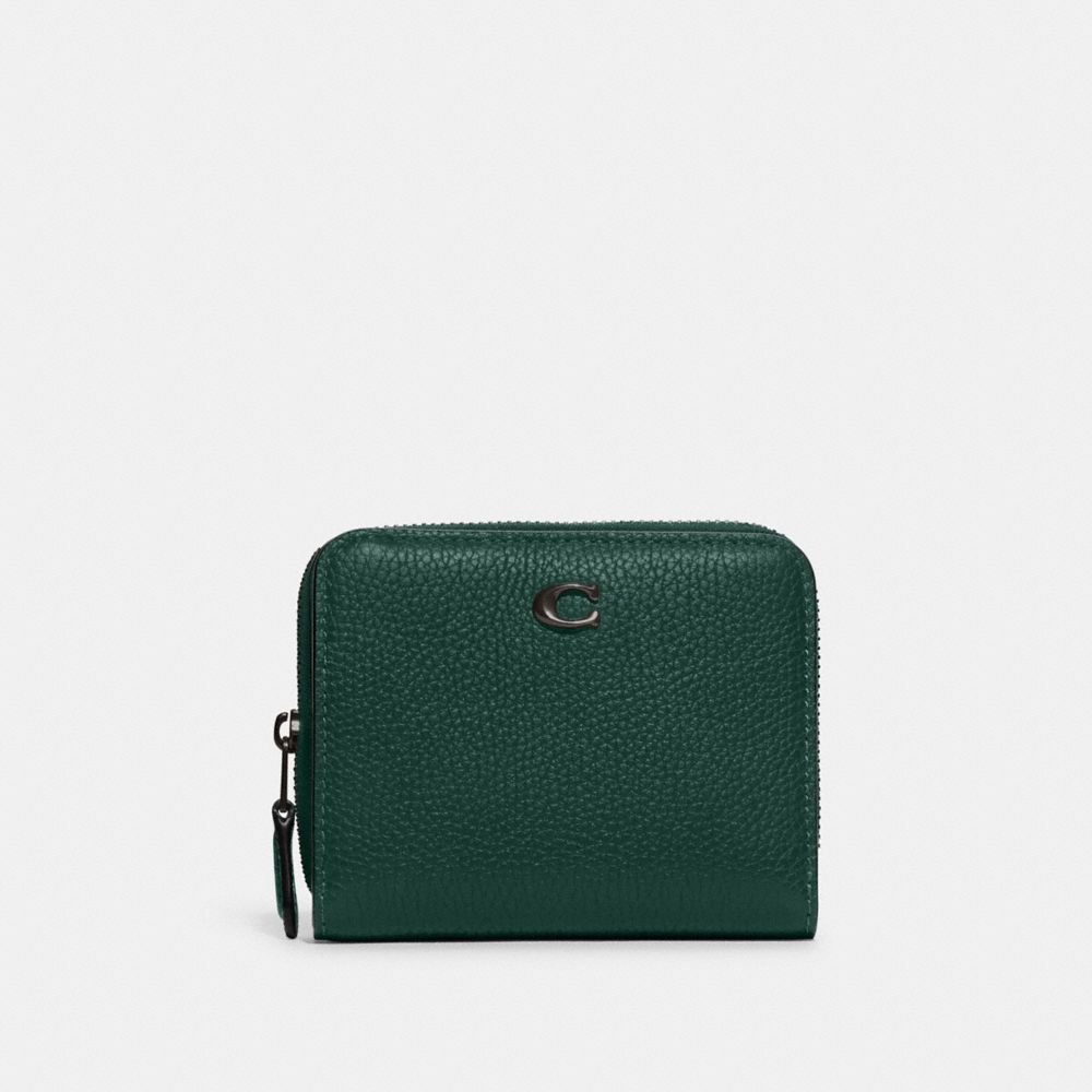 Crafted of polished pebble leather detailed with our Signature hardware, this compact billfold wallet features a convenient exterior zip pocket for coins, receipts, earbuds and other small essentials. It unsnaps to reveal six card slots and a full-length bill compartment.