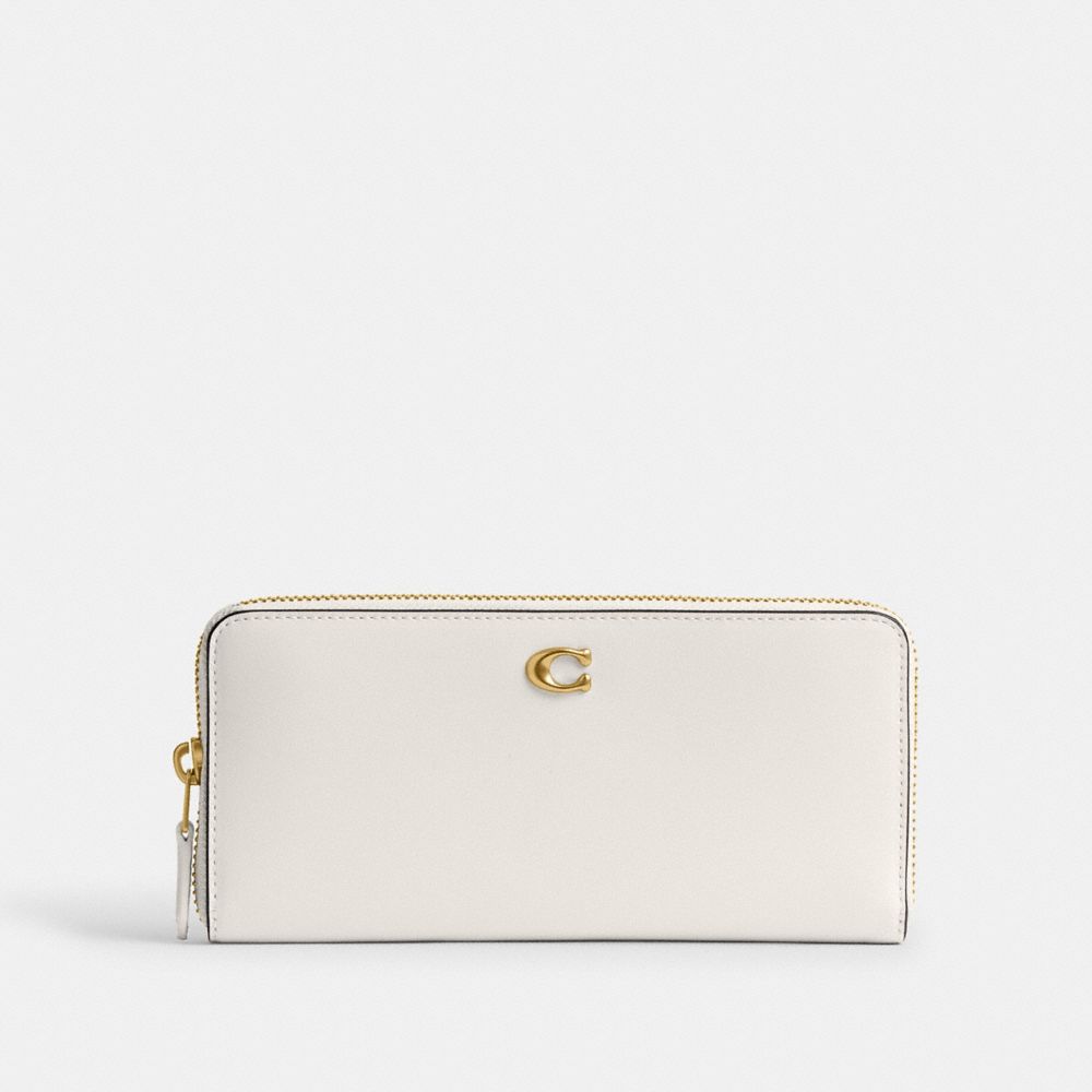 Crafted of refined leather detailed with our Signature hardware this comprehensive slim wallet keeps cards ID coins bills and receipts neatly organized in a secure zip-around design. It's finished with an outside slip pocket for easy access to essentials. COACH Essential Slim Accordion Zip Wallet - Women's - Brass/Chalk