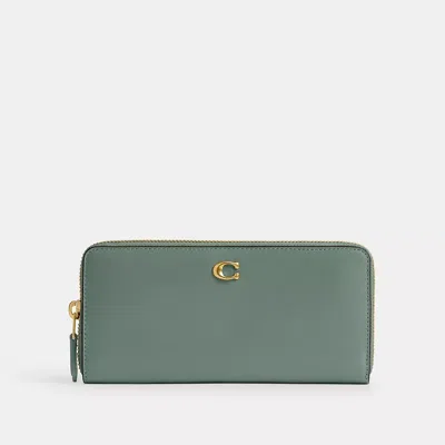 Crafted of refined leather detailed with our Signature hardware this comprehensive slim wallet keeps cards ID coins bills and receipts neatly organized in a secure zip-around design. It's finished with an outside slip pocket for easy access to essentials. COACH Essential Slim Accordion Zip Wallet - Women's - Brass/Sage