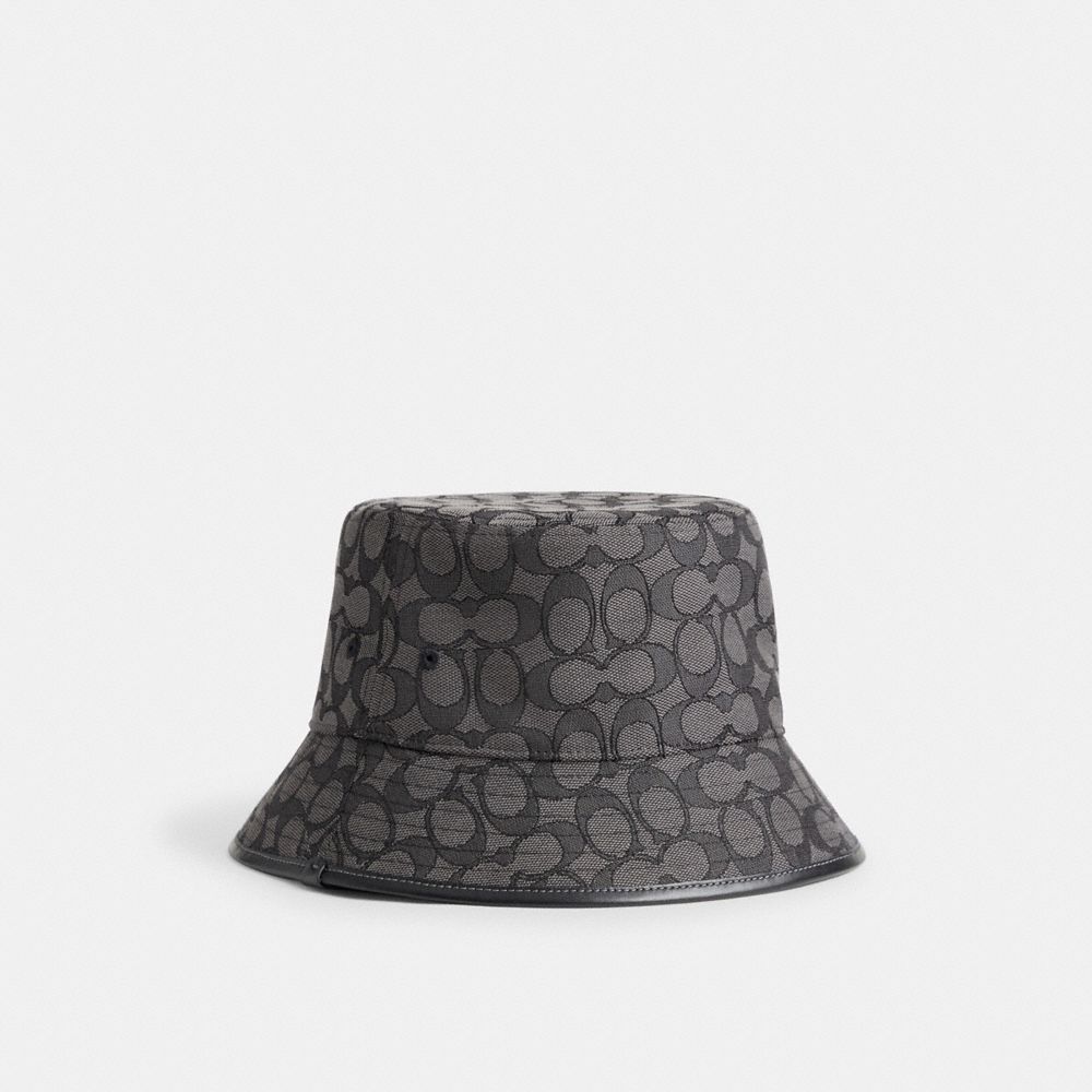 Add our Signature to your style. Finished with smooth leather in a nod to our heritage this retro-cool bucket hat is crafted of our Signature jacquard a material lovingly created with a blend of regenerative cotton and recycled polyester. It's all part of our commitment to rethinking and reducing our impact on the planet by repurposing waste materials. Coach Signature Jacquard Bucket Hat - Women's Size XS/S - Charcoal