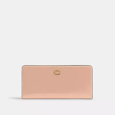 Crafted of refined leather detailed with our Signature hardware the perfectly named Slim Wallet organizes essentials in a slender silhouette. Featuring an exterior zip pocket for coins receipts earbuds and other small essentials the snap closure opens to reveal 12 card slots and multiple full-length bill compartments for easy organization. COACH?? Women's Essential Slim Wallet in Beige Leather