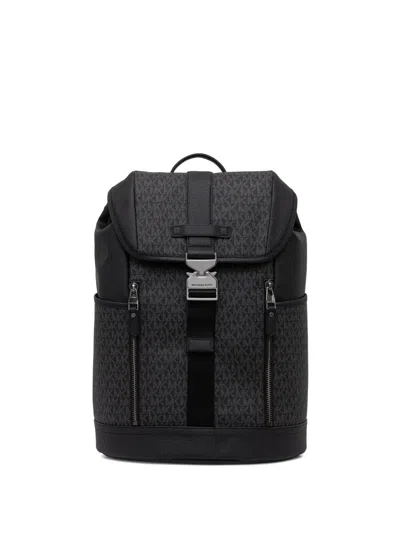 black monogram pattern top handle adjustable shoulder straps front zip pockets buckle fastening