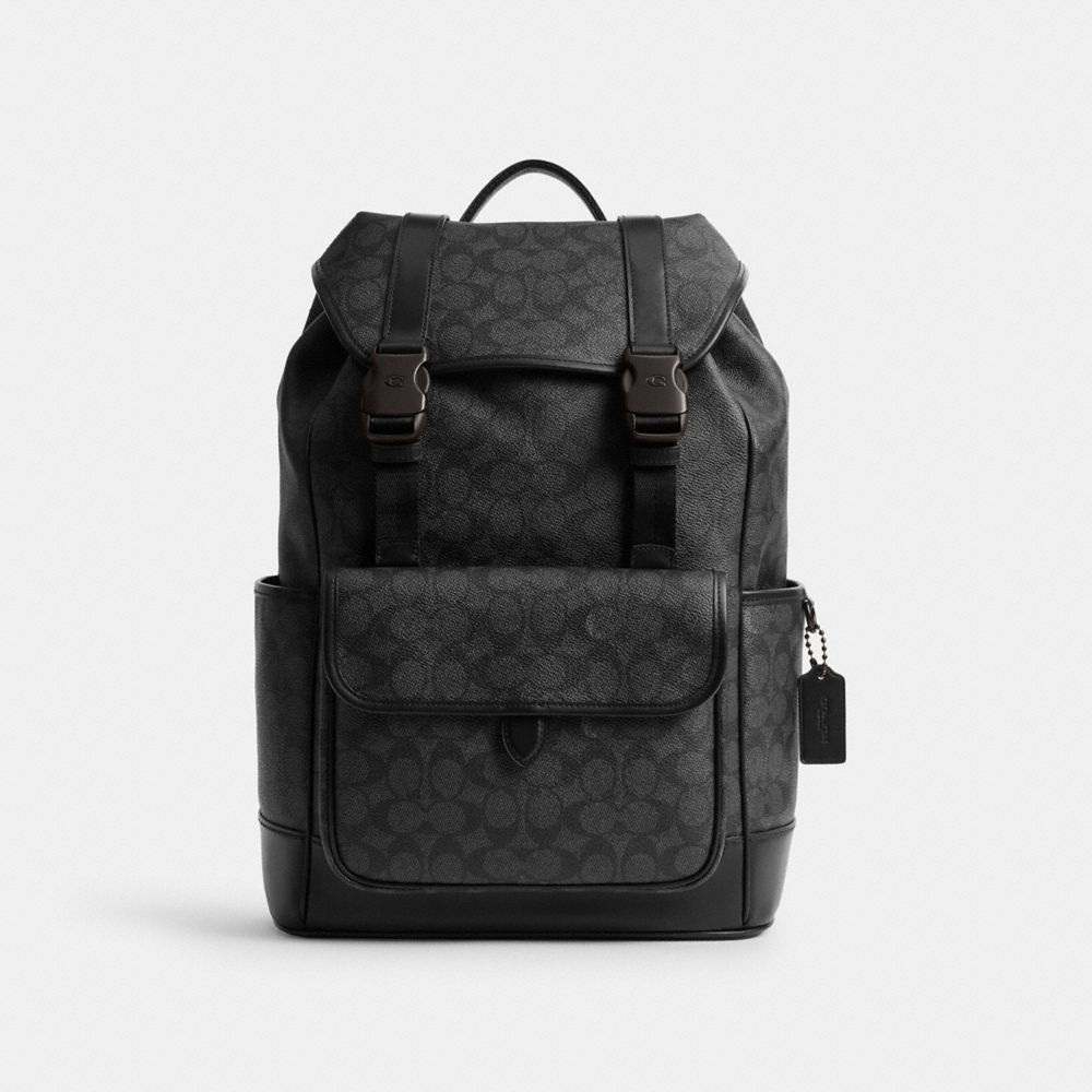 Made for a life in constant motion the League keeps your game plan on track. Crafted of our Signature canvas and refined leather this roomy backpack is a comfortable choice for every day with its padded back and straps. Organized with multiple pockets inside and out the sporty style has a dedicated laptop sleeve and plenty of space for notebooks water bottles and other essentials. An exterior zipper gives easy access to the main compartment. COACH League Flap Backpack In Signature Canvas - Men's - Charcoal Signature