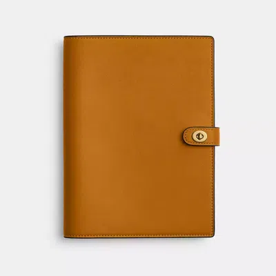 Perfect for jotting down plans dreams or spontaneous bursts of inspiration this heritage notebook is crafted of our buttery soft glovetanned leather. Finished with our iconic turnlock closure and edge painted by hand it comes filled with a 52-page spiral notebook marked with the memories and codes of our brand. Packaged in a Coach gift box this special keepsake is the perfect gift to give or receive. COACH Notebook - Women's - Brass/Ochre