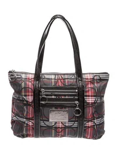 Coach Shoulder Bag Black & Red Nylon Plaid Print Silver-Tone Hardware Flat Handles & Dual Shoulder Straps Leather & Glitter Accents Single Exterior Pocket Satin Lining & Single Interior Pocket Zip Closure at Top | Coach Nylon Shoulder Bag in Black/Red