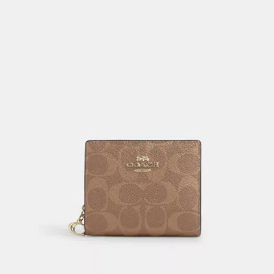 Signature coated canvas Trim partially made with recycled leather fiber layer Three credit card slots ID window Full-length bill compartment Snap closure Outside zip coin pocket 4 1/4 (L) x 3 1/2 (H) x 1 (W) Style No. CW789 Coach Outlet Snap Wallet In Signature Canvas - Beige