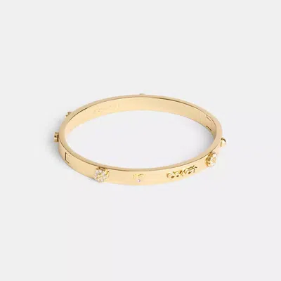 This polished bangle is detailed with iconic Coach motifs for heritage style. Finished with sparkling crystal accents it easily snaps open and shut with a hinged closure. COACH Pegged Hinged Bangle - Women's - Gold