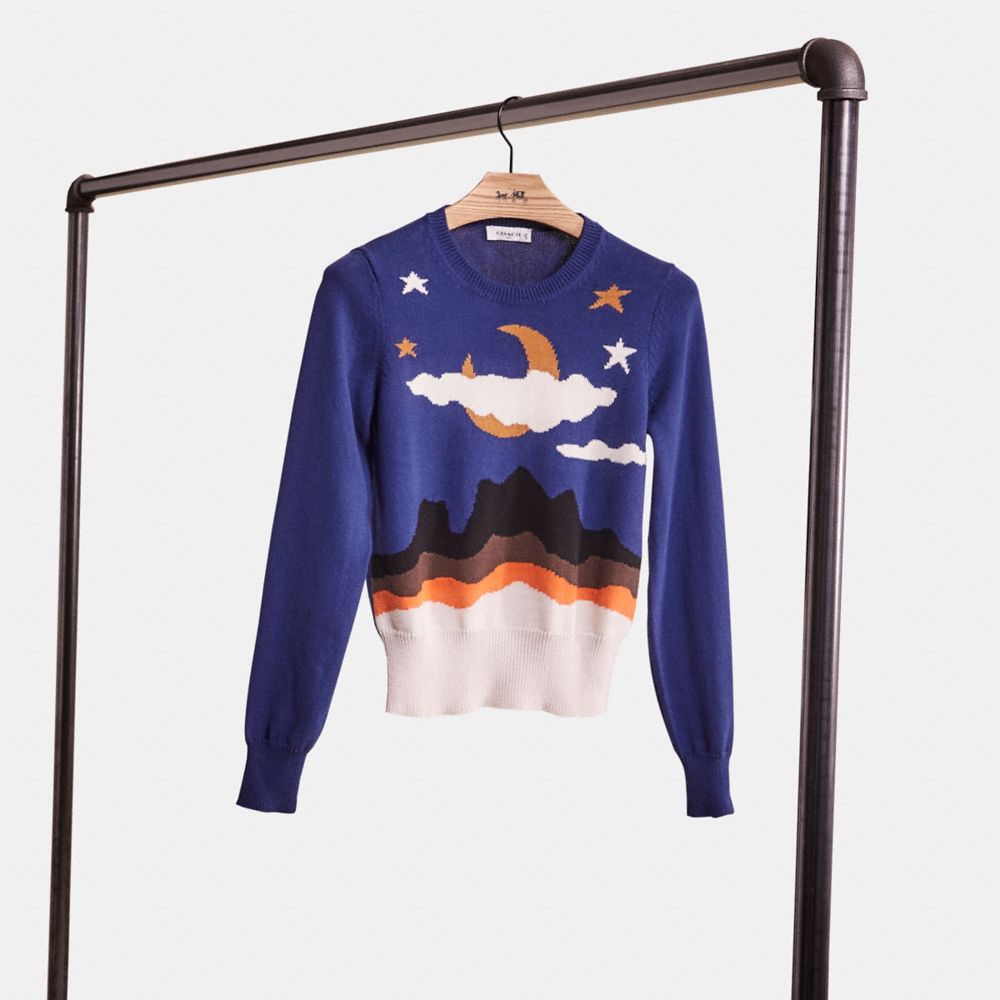 A little (re)love goes a long way. Sourced from the shelves of our Coach Repair Workshop this sweater was lovingly restored to its original condition by our talented craftspeople. Keeping waste out of landfills and reducing our impact on the environment is all part of our commitment to doing better for the planet (and all of us). A feel-good find it's your chance to get one of our most-loved styles if you missed out the first time. Wear it love it pass it on. Inspired by the desert landscapes of the American Southwest this classic-fit sweater features a serene nighttime canyon vista motif. The soft cotton-knit crewneck is finished with cozy ribbing at the collar cuffs and hem. Coach Restored Moonscape Crewneck Sweater - Women's Size XS - Midnight Multi