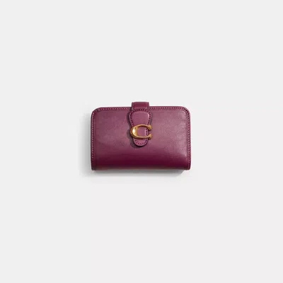 A little (re)love goes a long way. This Tabby Medium Wallet is a gently worn design restored to its original condition by the talented craftspeople at our Coach Repair Workshop. Keeping waste out of landfills and reducing our impact on the environment is all part of our commitment to doing better for the planet (and all of us). A feel-good find it's your chance to get one of our most-loved styles if you missed out the first time. Wear it love it pass it on. Crafted of smooth leather this bi-fold Tabby medium wallet is a modern take on an archival 1970s Coach design. Featuring an exterior zip pocket for coins earbuds and other small essentials it unsnaps to reveal ten card slots slip pockets and a full-length bill compartment. Coach Restored Tabby Medium Wallet - Women's - Brass/deep Berry