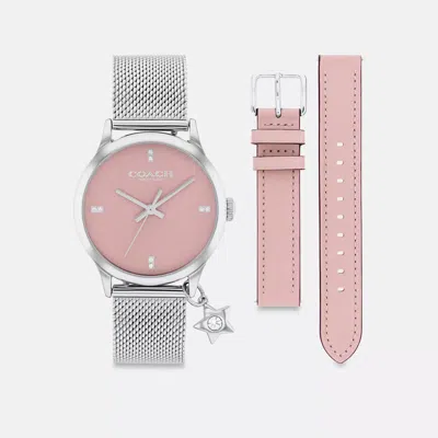 Stainless steel case and mesh bracelet Includes interchangeable leather strap with buckle closure Approx. case diameter: 32mm Mineral crystal Quartz movement Foldover clasp closure Water-resistant to 99 feet Packaged in a COACH gift box Style No. CAY94 COACH Ruby Watch Gift Set, 32 Mm - Multi, Size: WOMEN - Metal