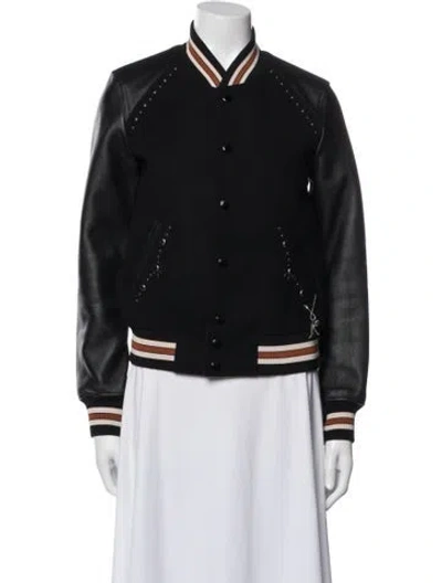 Coach Wool Bomber Jacket Black Colorblock Pattern Beaded & Studded Accents Stand Collar Slit Pockets & Snap Closure Fit: Jackets by Coach typically fit true to size. | Coach Wool Colorblock Pattern Bomber Jacket in Black, Women's US 0 | XS