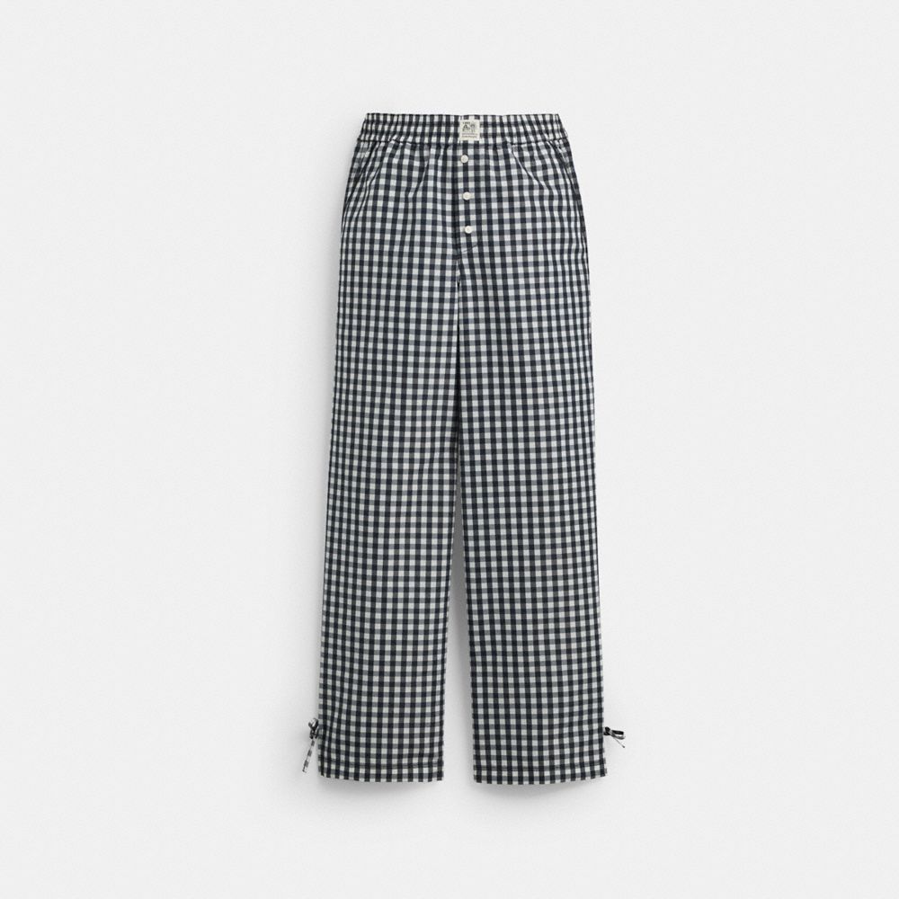 Checks all the right boxes: these gingham pants are crafted in 100% PET plastic (r PET) come with two side pockets and are finished with adorable bow detailing on each leg. Wear them with the matching top for a full-on fun fit. This product is part of our Coachtopia Loop collection a range of pieces crafted with at least 98% recycled PET plastic (r PET) and designed with a monomaterial approach. This means it can be recycled as part of our closed loop system. Coachtopia Loop Gingham Pants - Black/Cloud - Size Large