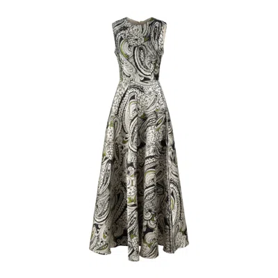 Item Color: Black and White | Made in Italy | Elegant long sleeveless dress made of fine jacquard fabric | Black and white paisley pattern with delicate touches of green gives a sophisticated and contemporary elegance | The flared line and wide skirt give movement and femininity, while the marked waist enhances the silhouette | Round neckline | Sleeveless | Back zipper closure | Main fabric composition: 100% Polyester | Secondary fabric composition: 51% Viscose, 49% Cotton