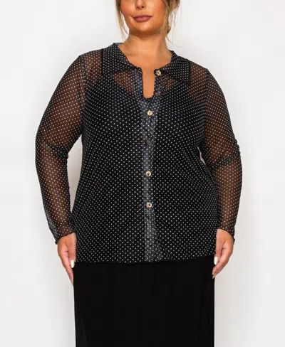COIN 1804 Plus Size Dot Mesh Button Front Long Sleeve Top In Black