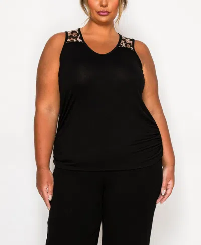 COIN 1804 Plus Size Leopard Print Mesh Yoke Inset Side Ruched Tank Top In Black
