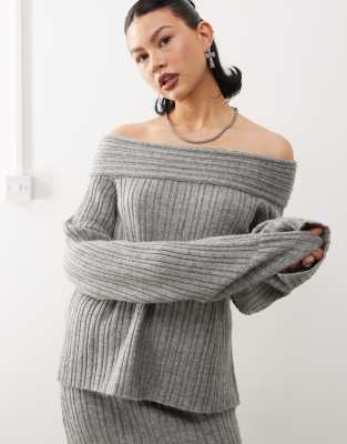 COLLUSION Knitted Ribbed Off The Shoulder Sweater In Charcoal - Part Of A Set-gray