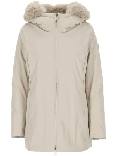 Colmar Originals down jacket in stretch nylon Ivory. Quilted interior. Padded with goose down. Hood with removable real fur trim. Double slider zip closure. Zip pockets. Logo patch applied on the left sleeve. Size in photo 40 50% polyester, 46% polyamide, 4% elastane Padding: 90% duck down, 10% duck feather Composition: Nylon-piuma Doca