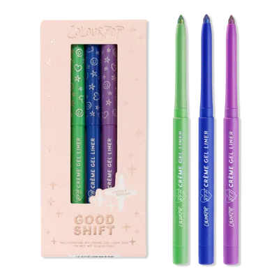 BFF CRME GEL LINER TRIO KIT 0.01OZ. Includes: Multichrome BFF Crme Gel Liner in Wild Idea (0.01 oz): Bright metallic lime green to true green to teal. Multichrome BFF Crme Gel Liner in Venture Blvd (0.01 oz): Vivid metallic cobalt blue to teal to purple. Multichrome BFF Crme Gel Liner in Actin' Up (0.01 oz): Bright metallic purple to bronze to deep green. Benefits: Glides on smoothly. Waterproof. 18-hour wear. Vibrant color-shifting pigments. Ultra-creamy formula makes blending easy. Perfect for tightlining. Versatile formula can also be smudged immediately after lining for a soft focus effect. Limited-edition kit. :