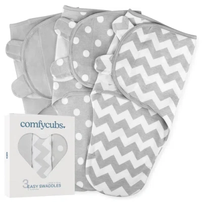 Discover the calming benefits of swaddling By recreating the secure and cozy feeling of mommy’s womb, Comfy Cubs Swaddle Blankets for newborns trigger the relaxation mechanism in your baby so he can enjoy more restful sleep. Bundled snugly in our baby sleep sack and free from involuntary reflexes that would startle him awake, your child will fall asleep more easily and remain asleep longer. Not only will your baby benefit from more sleep during his most formative days, but you’ll relax and enjoy watching him grow and develop. A comfortable baby is a happy baby Comfy Cubs Swaddle Blankets are made of 100% cotton so they’re breathable and thermo-regulating. They help your infant retain body heat in cooler weather, and they wick away moisture in warmer climates to keep him cool and congenial. Double-layer construction and anti-fray edge tape ensure long-lasting durability. Sturdy hook-and-loop tabs hold our swaddle wraps securely closed, unlike improvised receiving blankets that can fall loose as baby is passed from parent to parent or laid in his crib. Delight Mom with these thoughtful baby necessities Our swaddle blankets 3-pack ensures that there is always a baby wrap handy in the diaper bag, nursery and stroller basket. They are handsomely packaged, machine-washable for easy care, and they fit small or medium infants weighing 7-14 lbs. Their adjustable design ensures a snug, reassuring fit while allowing growing room for your baby to make the most of the swaddling experience. Nurture your infant’s feelings of safety and trust. Add a Comfy Cubs Baby Swaddle Wrap 3-Pack to your cart today. 0-3 months, 7-14 Pounds, up to 26 inches 3-6 months, 14-18 pounds, up to 30 inches. Recreate the Womb when you wrap-up your bundle of joy in a swaddle blanket by Comfy Cubs. This snug baby wrap helps ease your baby’s transition into the world and prevents spontaneous movements from waking him. Enjoy More Sleep Yourself as your baby learns to self-soothe. The light pressure of our swaddle sack deters the startle reflex that typically awakens unswaddled babies. This results in much needed rest for weary parents. Easier to Use than a traditional baby blanket, a Comfy Cubs allows you to confidently swaddle up your infant. Its modern design includes a leg pocket and adjustable hook-and-loop tabs that fasten securely over baby’s chest for a cozy, reassuring fit. Attractive Gift Box makes our swaddle blankets thoughtful and appreciated baby shower gifts for mommies-to-be. These swaddles are baby registry must haves for new parents. Designed for long-lasting durability and easy care, they’ll serve a growing family for many years.