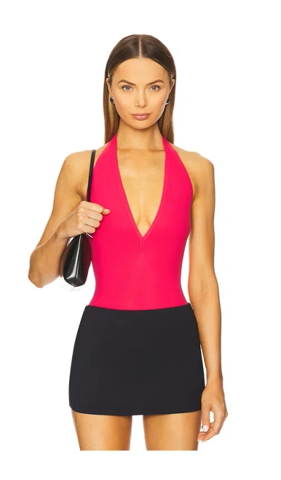 Commando Ballet Deep Plunge Bodysuit in Fuchsia. 87% nylon 12% elastane 1% cotton. Machine wash cold. Snap button gusset closure. Halterneck styling. Plunging neckline and open back. Lightweight stretch jersey fabric with Brazilian back. CMAN-WS193. KT075. Through innovative design and technical fabrics, commando creates versatile, luxurious pieces that make your wardrobe work harder so that your style can be effortless. From their sleek ballet bodysuits to their best-selling leggings and tights, to the raw-cut underwear that started it all, commando is the go-to brand for seasonless staples that you can build a look around.