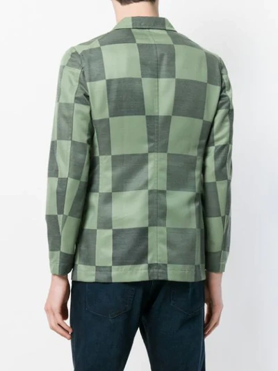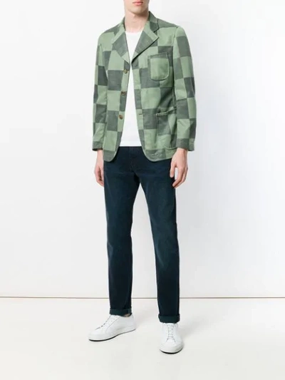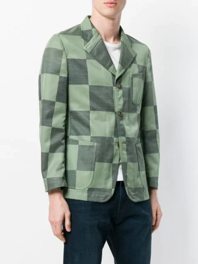 Founded in Tokyo in 1969 and also prestigiously present in Paris, Comme des Garçons is a luxury Japanese house deeply associated with the arts and international cultural projects. Fashioned in two tones of green, this checkboard jacket has its pattern as the central attention stealer. With a slightly slim fit, it features notched lapels, a front button fastening, long sleeves, patch pockets and a curved hemline. Please be mindful that this piece has led a previous life, and may tell its story through minor imperfection. Purchasing this item continues its narrative, so you can be confident that you’re making a POSITIVELY CONSCIOUS choice for the planet.
