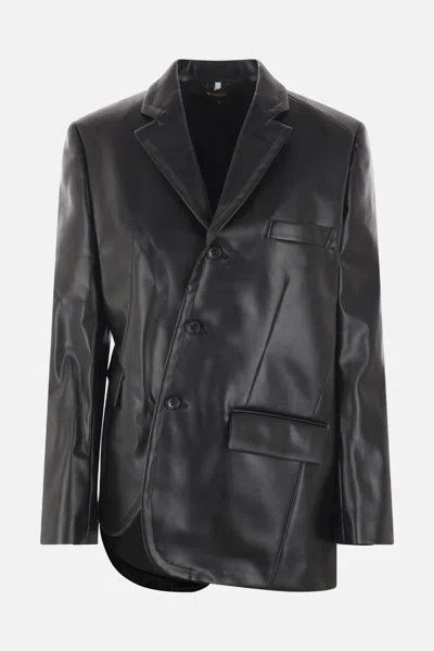 Comme des Garçons' single-breasted jacket crafted in black faux leather. It features notched lapel, button closure, structured shoulders, long sleeves with buttoned cuffs, multiple pockets and asymmetric hem. Lined interior.. Gender: Women. Material: SYNTHETIC LEATHER. Color: Black. Made in: JP. Product ID: GNJ021W241BLACK. *Import tax/duty will be calculated at checkout (If applicable)