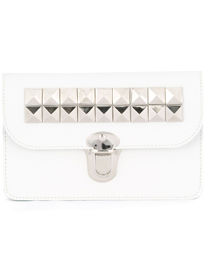White calf leather 'Studs' wallet from Comme Des Garçons Wallet featuring a foldover top with push-lock closure, silver-tone stud detailing, an internal zipped pocket, multiple interior compartments and an embossed internal logo stamp.