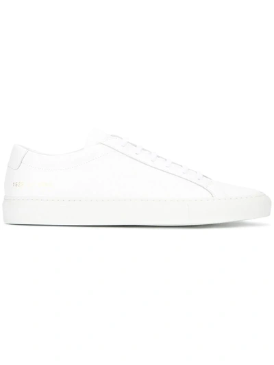 White leather Achilles Low sneakers from Common Projects featuring a round toe, a lace-up front fastening, a brand embossed insole, a white rubber sole and a gold-tone serial number stamp to the outside.