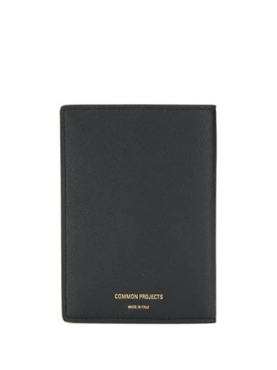Black leather bifold document holder from Common Projects featuring internal slip pockets and multiple interior card slots.