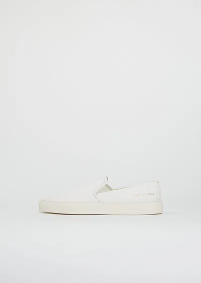 Common Projects white low top slip on sneakers with elasticated side panels in dense cotton canvas. Features a leather insole and an off-white rubber treaded stitch-reinforced sole. Fully lined in tonal leather. Finished with signature gold foil style numbers on outer heel. Sizing: European (37-41). Color: White. Upper: 100% Cotton. Sole: 100% Rubber. Imported. SS26CP009