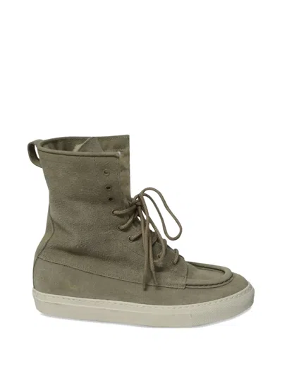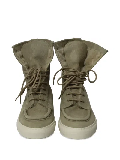 grey suede lace-up closure gold-tone stamp shearling rubber sole Condition: EXCELLENT. This previously owned item is in near-perfect condition with no signs of damage or use.