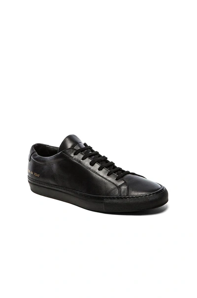 Common Projects Article 1528 Original Leather Achilles Low in Black - Black. Size 42 (also in 40, 41, Eur 41 / US 8). Leather upper with rubber sole. Made in Italy. COMF-MZ201. 1528-7547. About the designer: In 2004, armed with a desire to create the perfect sneaker, designers Flavio Girolami and Peter Poopat introduced a line of minimalist shoes to sneaker freaks around the world. Since the debut of their first collection, which featured only black, white, and gray sneakers, the line has grown to encompass more than your average laced-up low top. Today, Common Projects offers a range of colors, non-sneaker styles, and materials that are luxurious in look and feel.