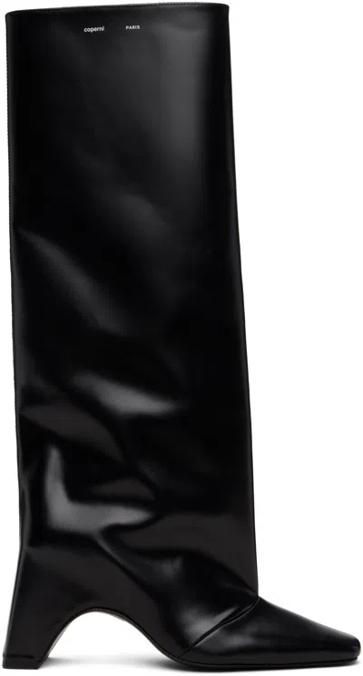 Coperni Bridge Boot in Black - Black. Size 41 (also in ). Ruched leather upper with smooth leather sole. Made in Spain. Pull-on styling. Square toe. Approx 83mm/ 3.25 inch heel Approx 406mm/ 16 inch shaft Shaft measures approx 14 in circumference. CRNF-WZ18. COPSH03420. About the designer: