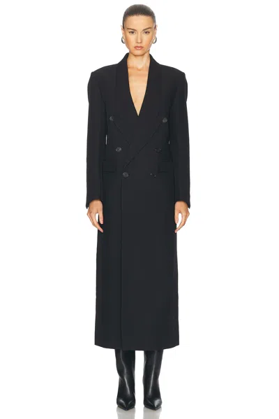 Coperni Long Coat in Black - Black. Size XS (also in L, M, S). Self: 100% recycled polyester Lining: 52% acetate 48% viscose. Made in France. Dry clean only. Front double-breasted button closure. Structured padding at shoulders. Side flap pockets. Buttoned cuffs. Twill fabric with back vent Please note: Belt is not included. CRNF-WO20. COPM22F3004. About the designer: