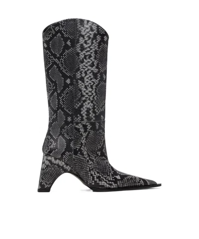 Snake-print embossed leather upper, pointed toe, polished leather lining, rubber-injected block heel, and leather sole.