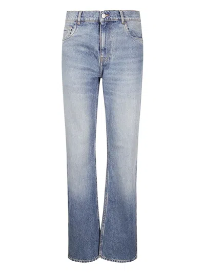 Coperni boyfriend blue cotton jeans with distressed wash, high waist, belt loops, button and zip closure, five-pocket design, back strap detail, silver logo buckle, straight leg. Composition: 100% Organic Cotton, Lining: 50% Polyester, 50% Cotton