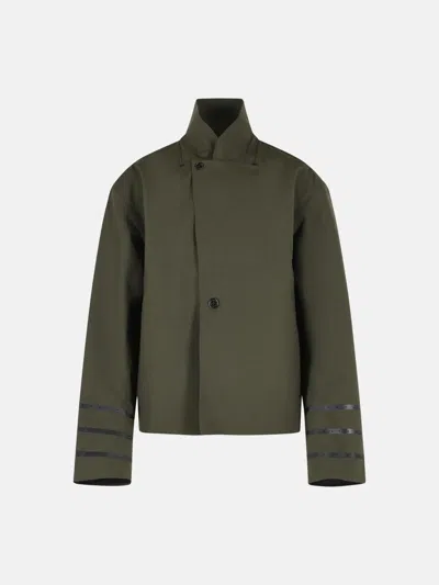 Raised neck, front button fastening, side slit pockets, black hole cuffs and details, elastic back drawstring at the waist, straight hem, loose fit
