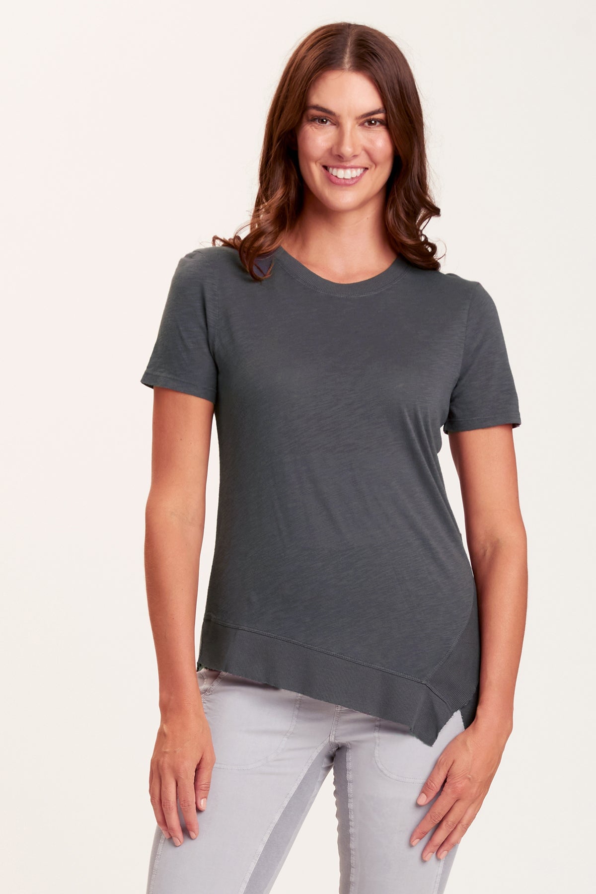 A tee re-imagined. Features a crew neckline, short sleeves, asymmetric hemline with rib detail, and a rib insert on side.Cotton Modal Slub: 60/40 Cotton/Modal.2X1 Rib Trim: 48/48/4 Cotton/Modal/SpandexCenter Front: ~21.5"Center Back: ~24.5"Color Description: Our favorite dark greyPreshrunk.Machine washable.Imported.MODELVeronica is wearing size Small.Height: 5'10" | Bust: 34B | Waist: 26" | Hip: 36.5"