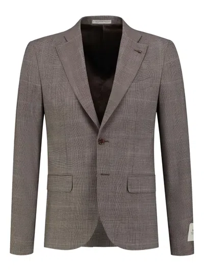taupe brown front button fastening notched lapels two side flap pockets logo patch at the sleeve